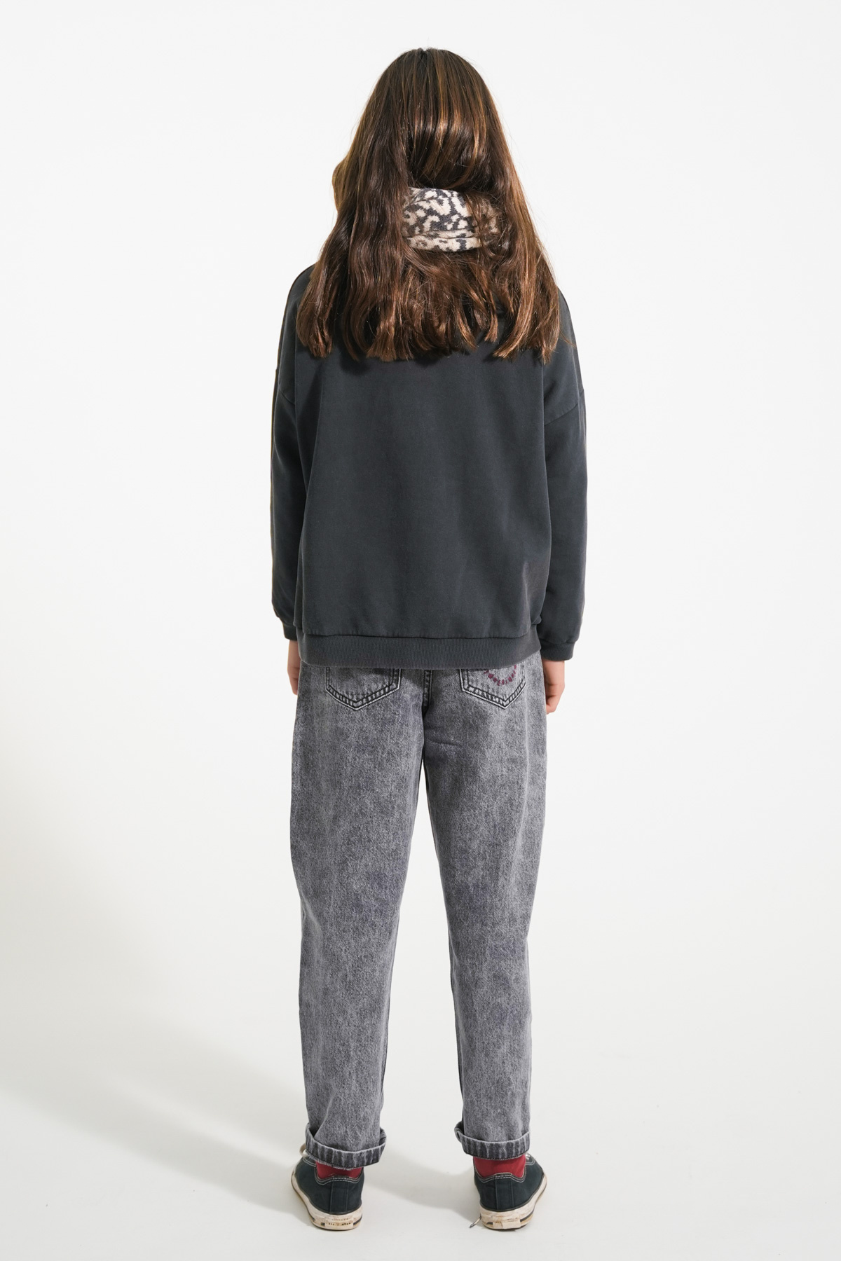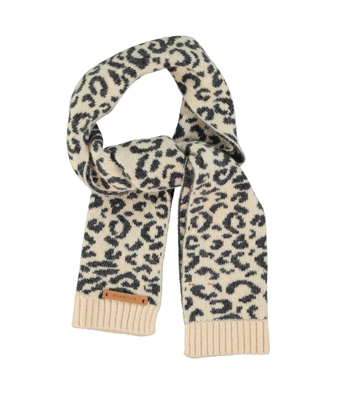 Jacquard knitted scarf with animal print, detailed with logo leather label.